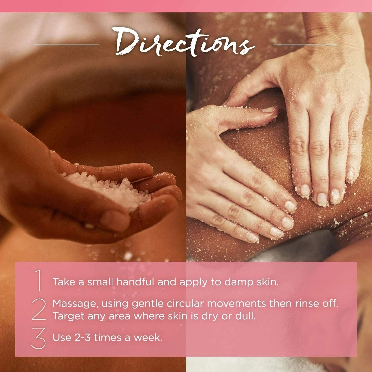Directions for Use: Apply a small amount of scrub to damp skin. Massage gently in circular motions to exfoliate, then rinse thoroughly with warm water. Use at least twice a week for optimal results.