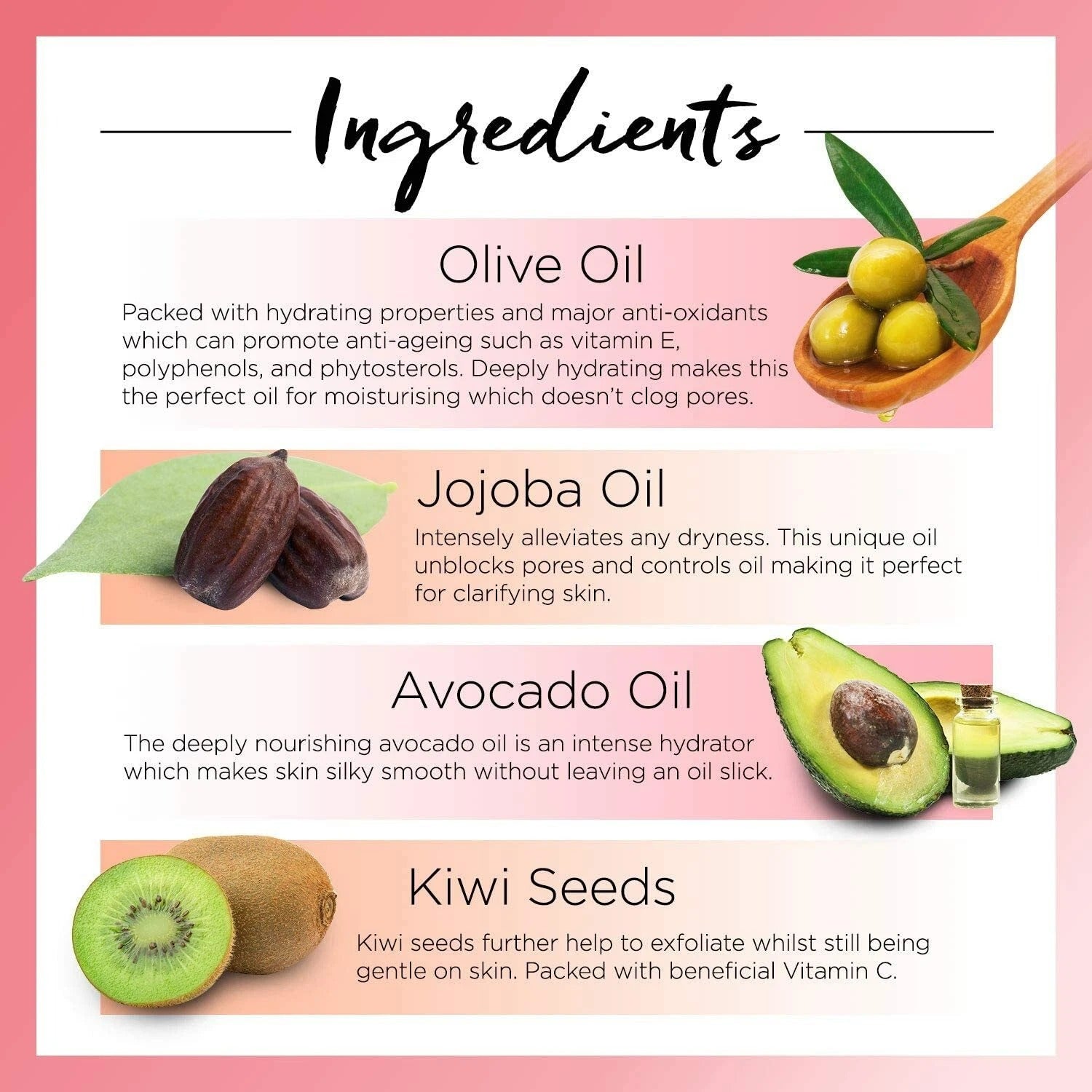 - Nourishing Hydration: A blend of olive, avocado, and jojoba oils deeply moisturizes, eliminating dryness and leaving skin soft and supple.